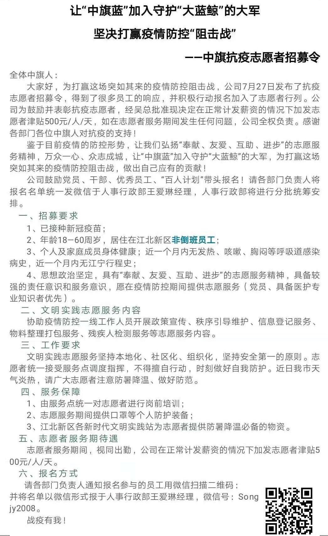 自7月20日南京祿口爆發(fā)新一輪新冠疫情以來(lái),中旗科技立即行動(dòng)組織全員應(yīng)對(duì)這場(chǎng)防疫攻堅(jiān)戰(zhàn)。根據(jù)政府防疫布控要求,嚴(yán)格落實(shí)各項(xiàng)防疫防控措施。確保每位員工做好個(gè)人防護(hù)、定時(shí)定點(diǎn)核酸檢測(cè)。公司還于7月27日、29日兩度發(fā)布中旗科技“抗疫志愿者招募令”,倡議符合條件的員工,尤其是黨員、干部、優(yōu)秀員工、“百人計(jì)劃”積極報(bào)名,志愿加入江北新區(qū)疫情防控一線工作中,協(xié)助開(kāi)展政策宣傳、秩序引導(dǎo)、檢測(cè)協(xié)助等社會(huì)防疫活動(dòng)。通知一經(jīng)發(fā)布,得到了中旗員工廣泛響應(yīng)和積極報(bào)名。